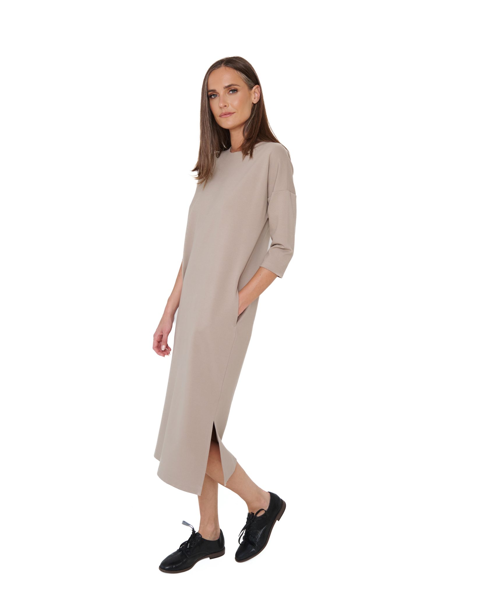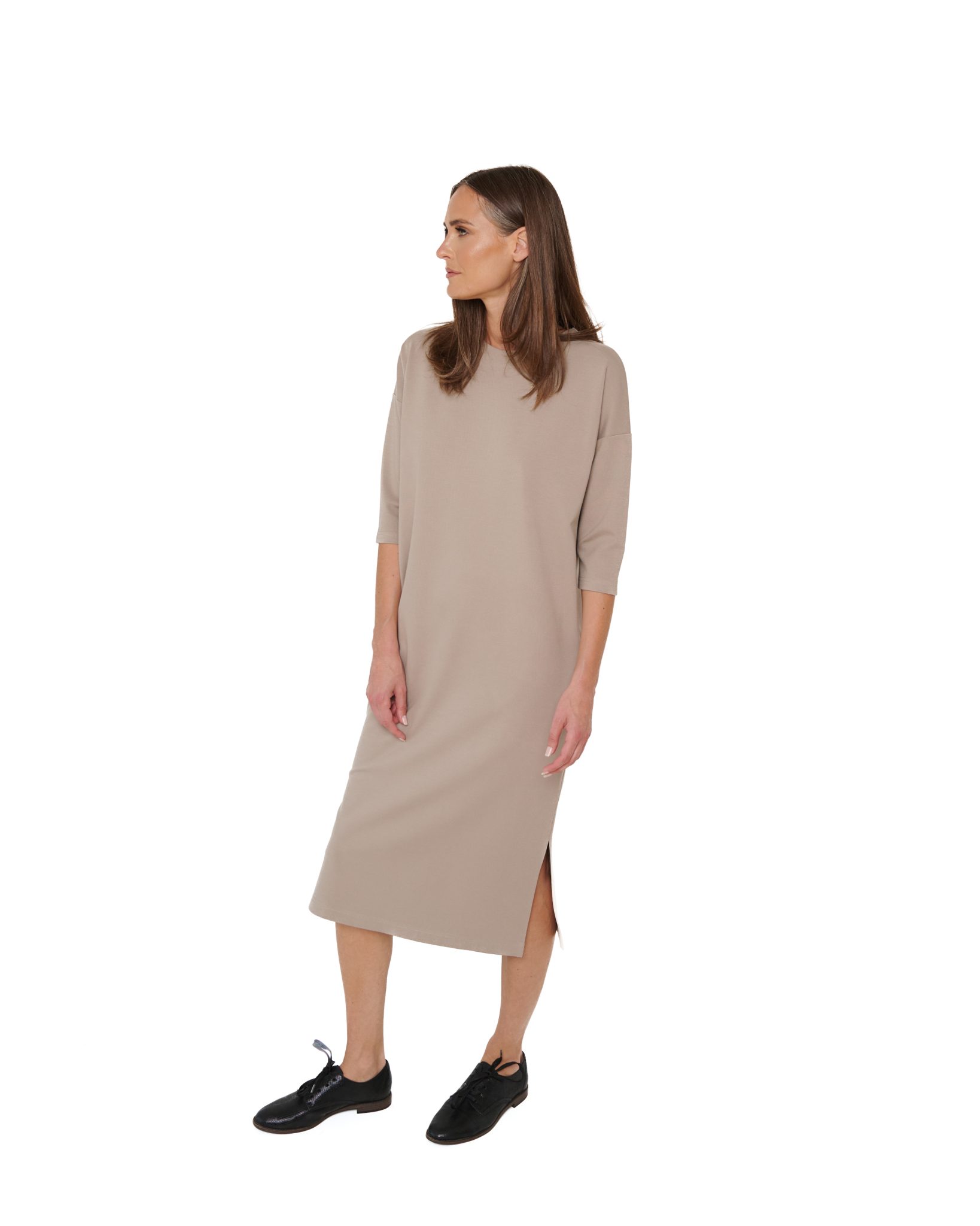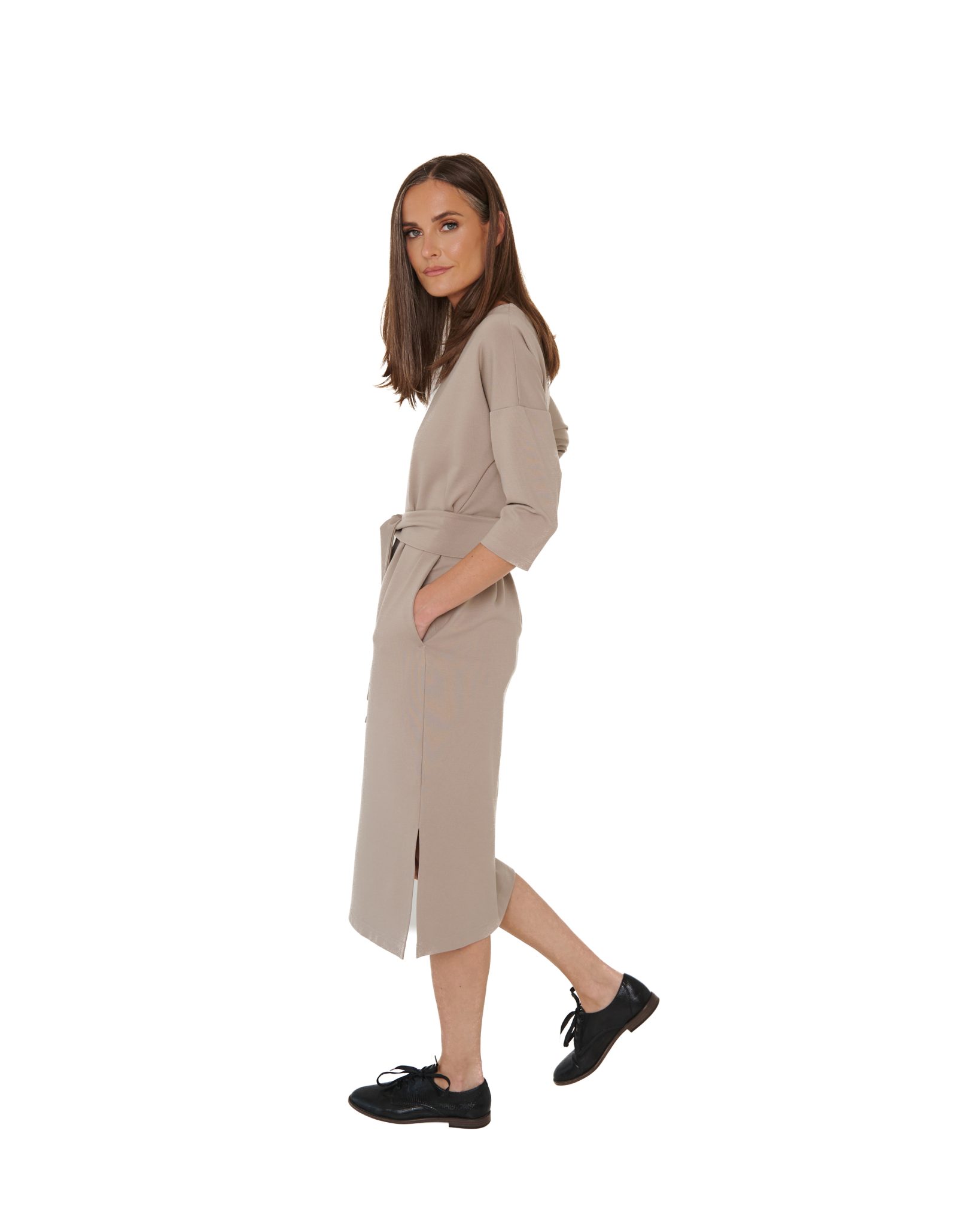 Mõnusalt avar, lahe midi-pikkus, lõhikud mõlemal küljel ja kitsamad 3/4 pikkused varrukad, et mahuks mugavalt jakkide või kampsunite alla. Külgedel on taskud. Kleidil on kaasas vöö.