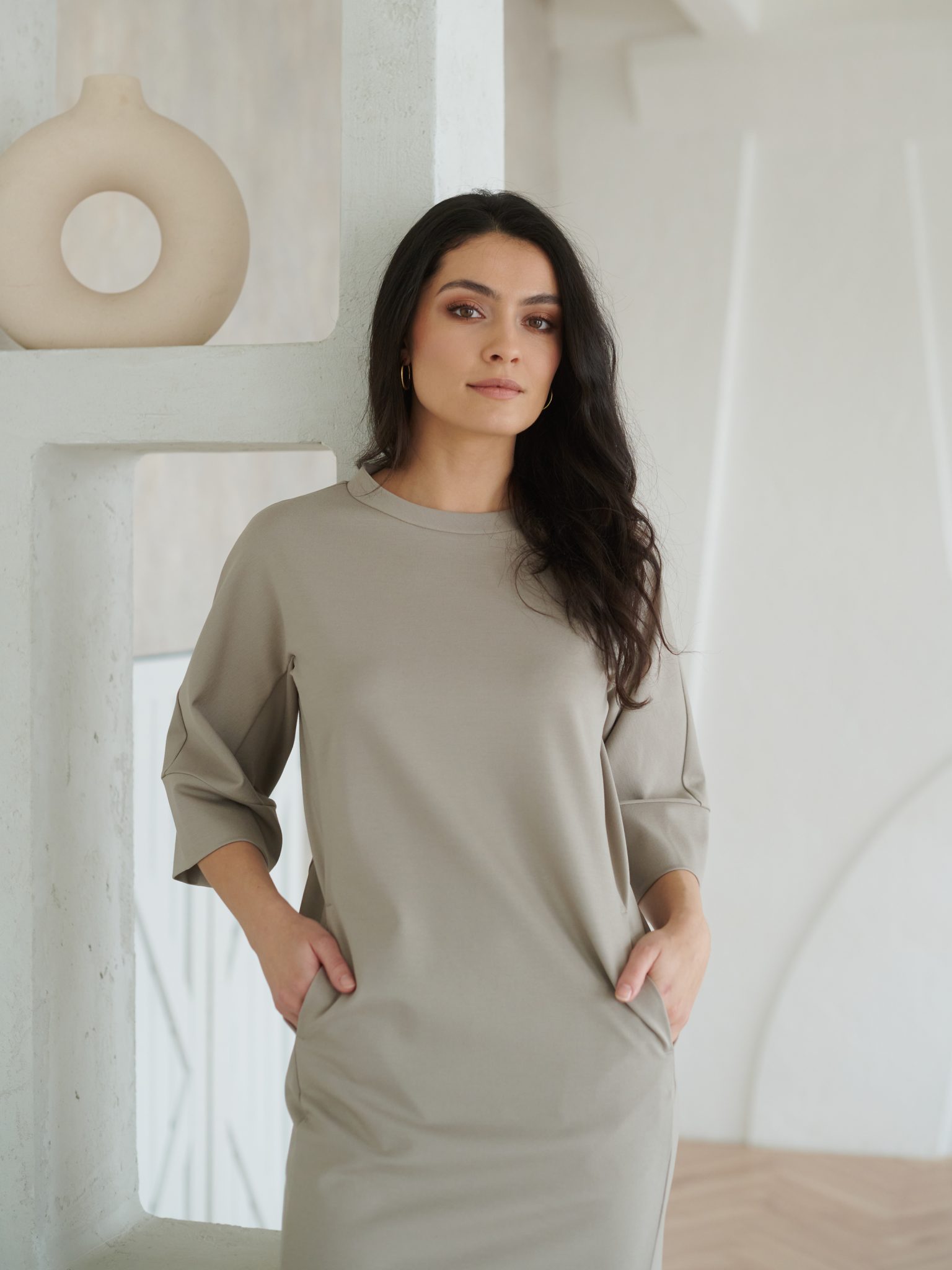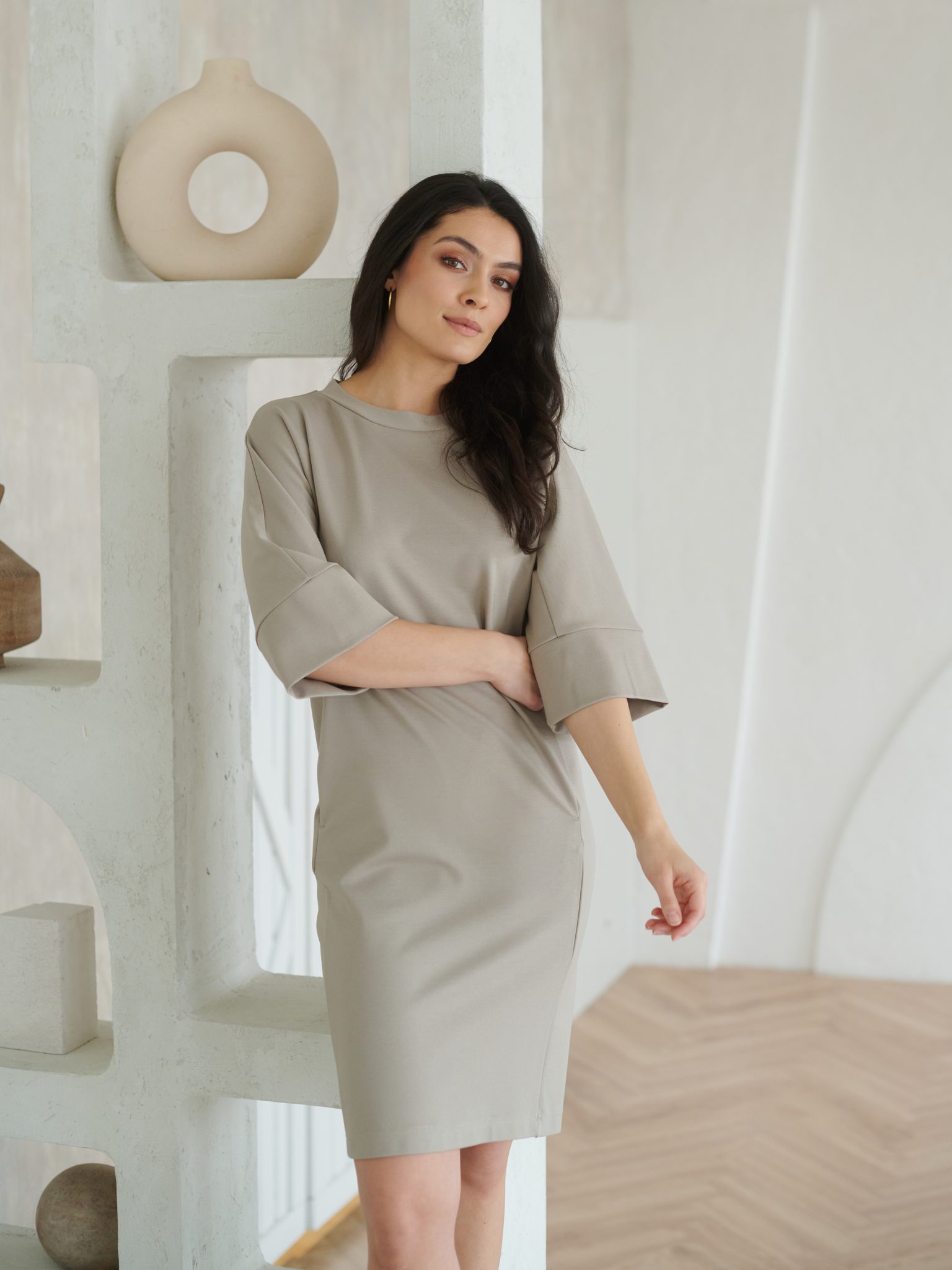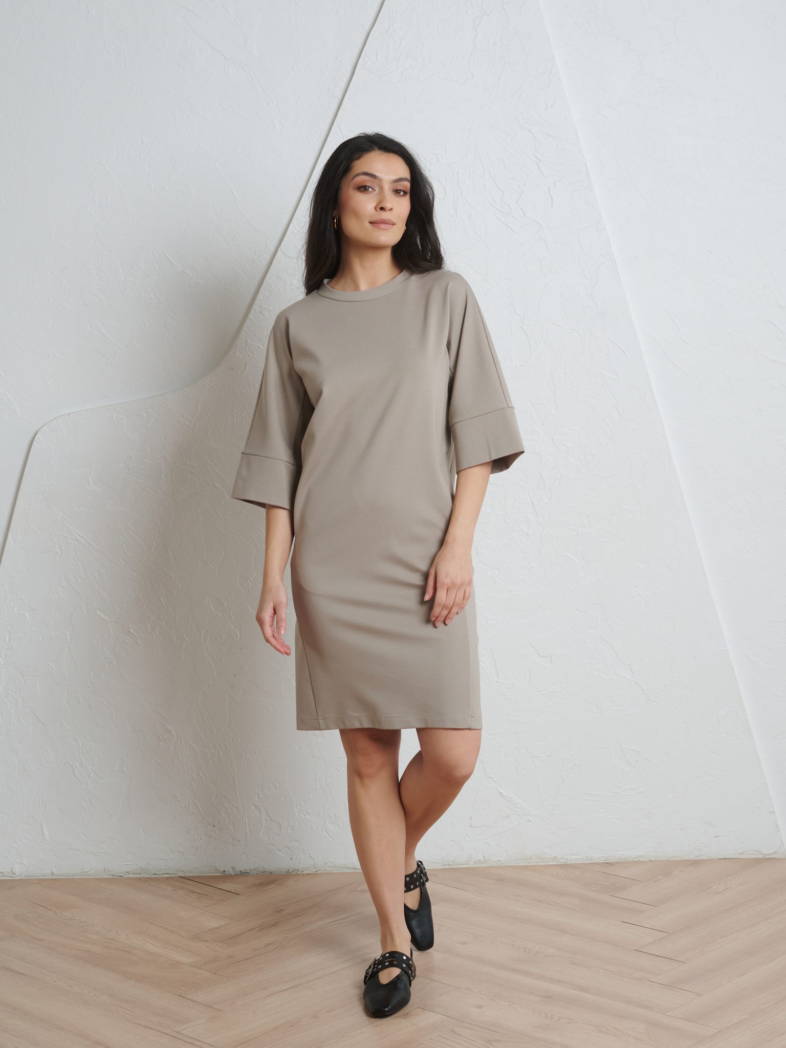 Pehmest ja venivast vähekortsuvast kangast valmistatud kleit pakub mugavust kogu päevaks ning sobib suurepäraselt ka reisile kaasa. Kolmveerandpikkuses varrukad ja kergelt kitsenev alläär loovad kauni silueti, samas kui õmblustesse peidetud taskud lisavad praktilisust.